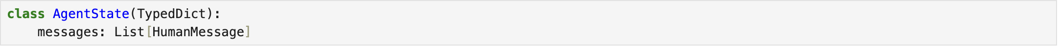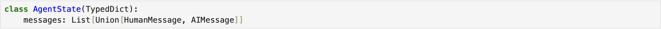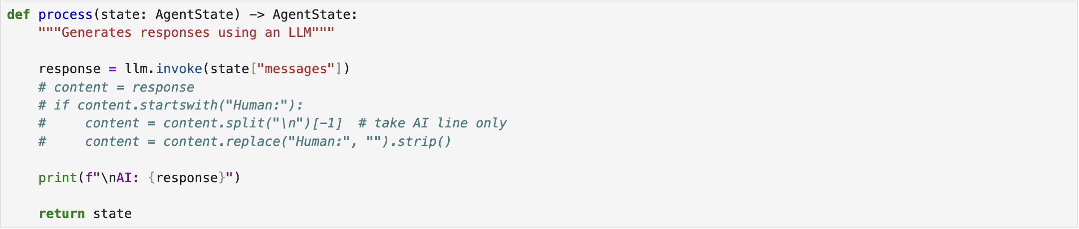 In the first scenario, the objective is to develop a simple chatbot that engages in conversations with the user without utilizing memory to retain previous interactions. To achieve this, the processor node leverages a large language model (LLM) to generate responses. As the nitial step, we define a shared data structure, called AgentState, to manage and maintain the application's state during execution [1].