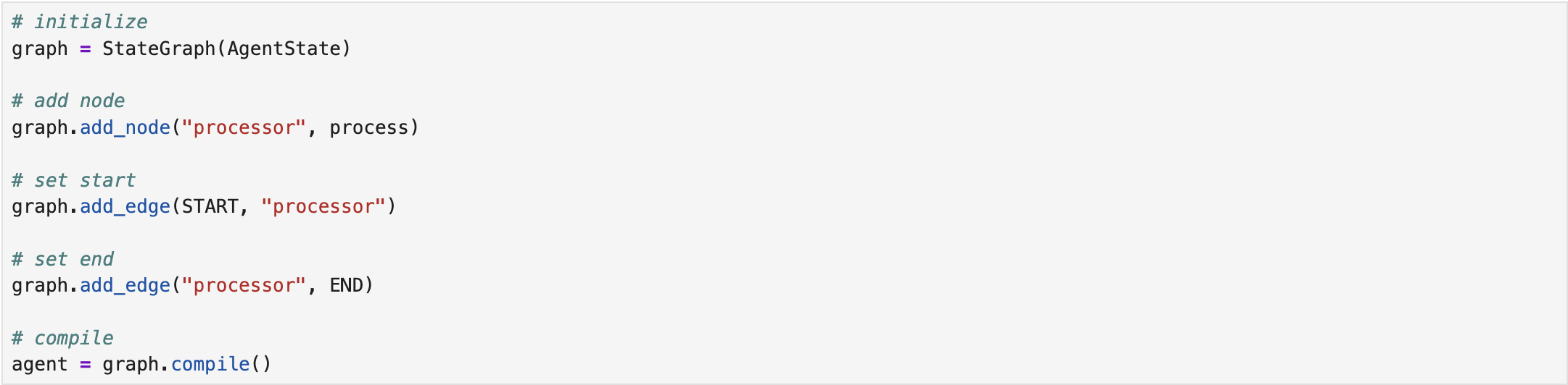 The next step involves constructing the graph. To begin, we initialize an empty graph in LangGraph, specifying its input type as state (AgentState). We then add the processor node to the graph, followed by connecting it to both the start and end states. Finally, we compile the graph and store it in a variable for subsequent execution [1].
