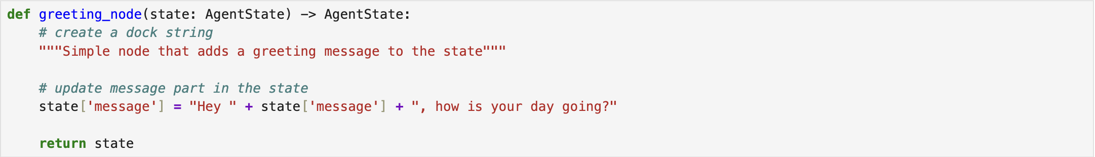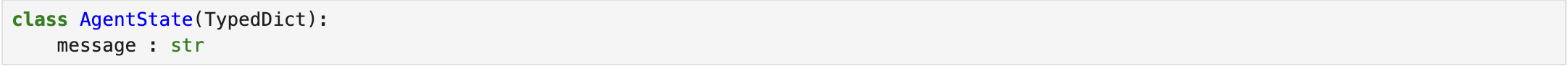 In this example, the primary objective is to receive the user's first name as input and display the message: "Hey {user’s first name}, how is your day going?" In this regard, we first need to create a shared data structure to keep track of information as the application runs. The defined structure, AgentState, records the system's state [1].