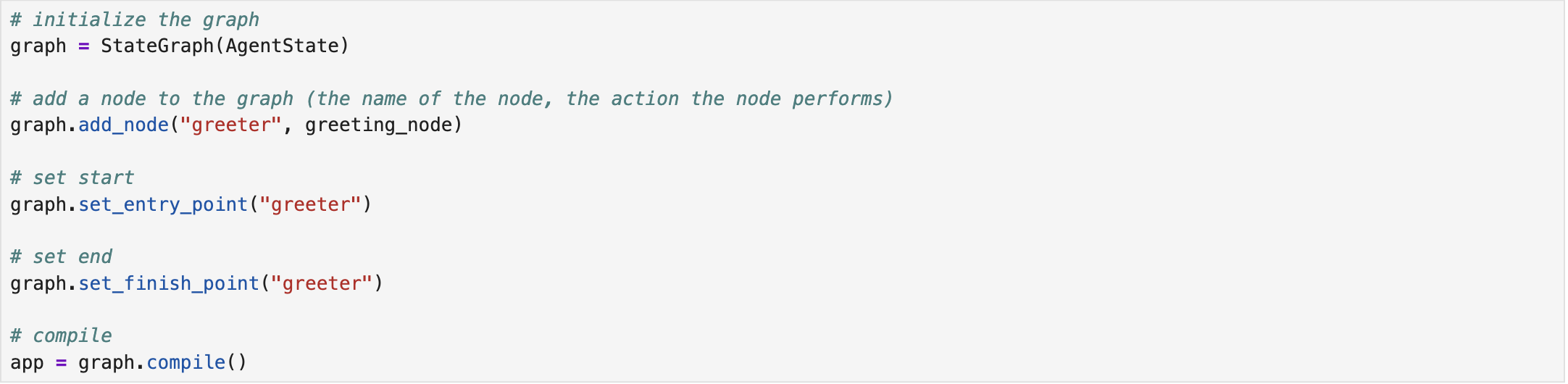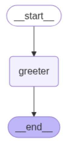 The next step involves constructing the graph. To begin, we initialize an empty graph in LangGraph, specifying its input type as state (AgentState). We then add the greeter node to the graph, followed by connecting it to both the start and end states. Finally, we compile the graph and store it in a variable for subsequent execution [1].