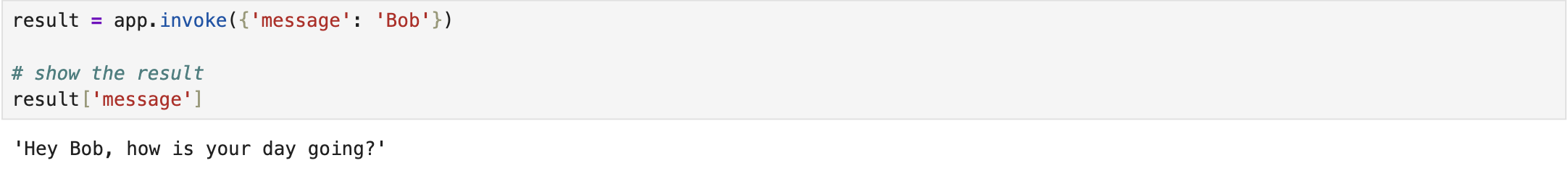 Lastly, we invoke the compiled graph by passing an example first name to that. The results indicate that the designed graph-based system could successfully meet the intended objective [1]. The complete implementation script is available on Single-Node Graph - Single Input.