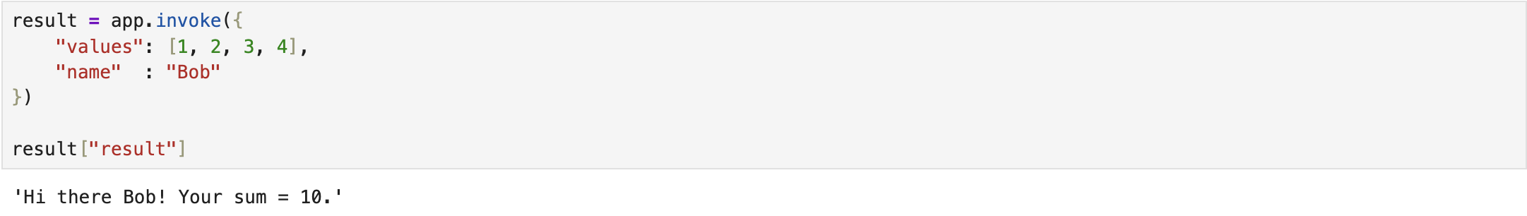 We repeat the same steps for the multi-input scenario, in which a list of values is provided to the system alongside the user's first name. The system then returns a message that incorporates both the user's first name and the sum of the values. Compared to the single-input scenario, the AgentState in the multi-input scenario handles two types of input data: the user's name as a string and the values as a list of integers [1].