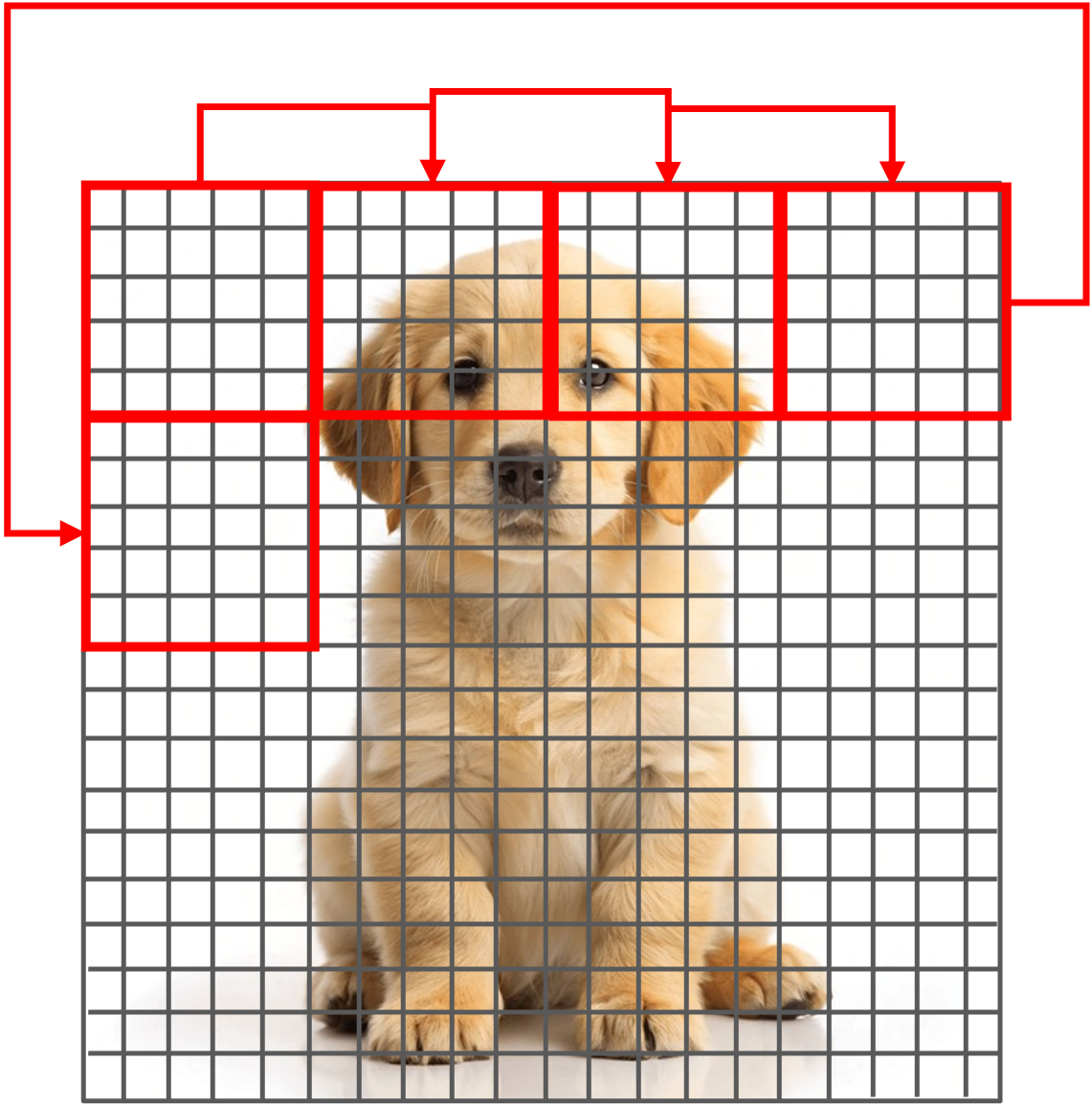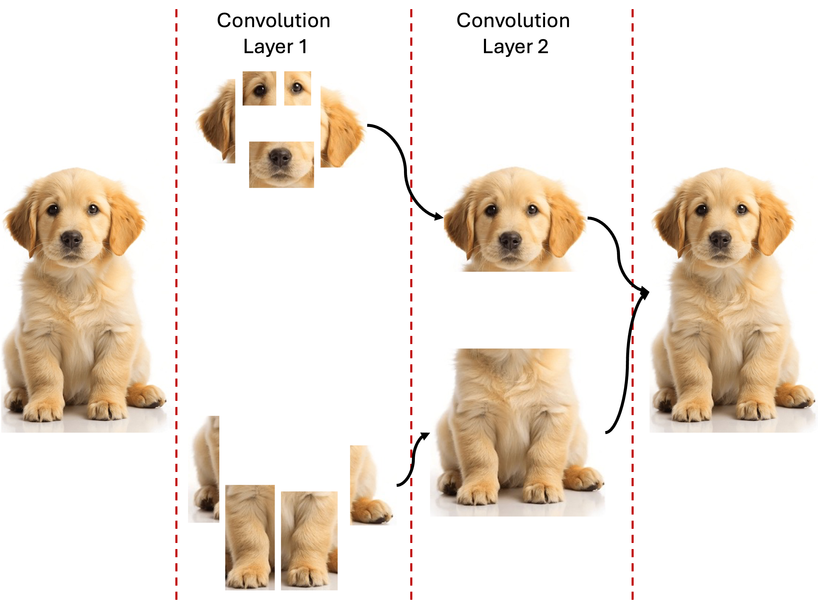 In this example, an initial image (a cute dog; image source: Pinterest [3]) is filtered by kernels in the first convolutional layer. The upper filters learn to detect features such as eyes, nose, and ears, while the lower filters recognize paws. In the second layer, the filters identify higher-level structures such as the head and body. This hierarchical learning enables CNNs to build complex visual understanding from simple features.