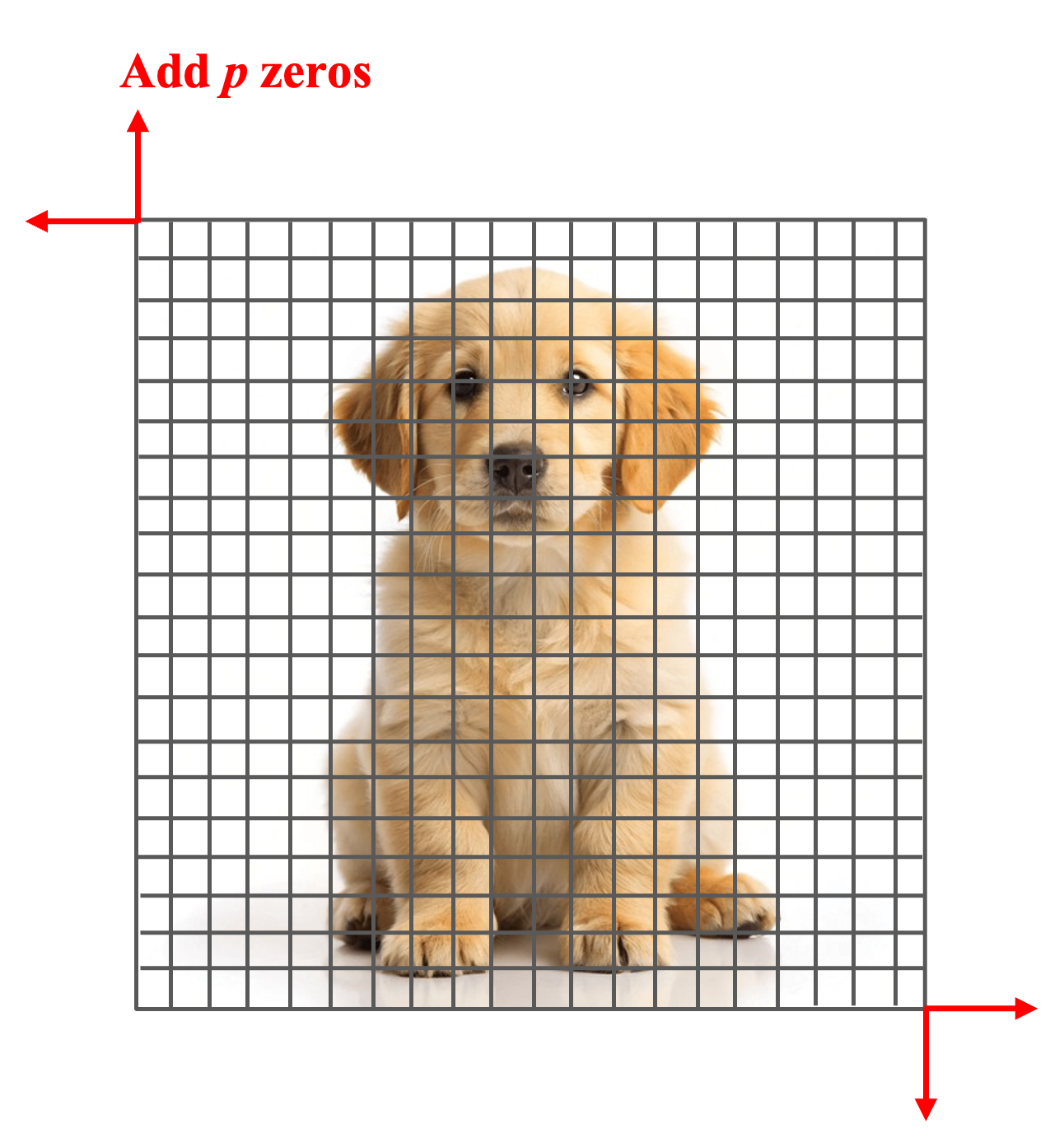 Same Padding is applied such that the output size equals the input size. Let \(p\) be the padding size. Since padding happens for rows (up and down) and columns (left and right), the new input images size must follow \(n' = n + 2p\). Therefore, we have [2].