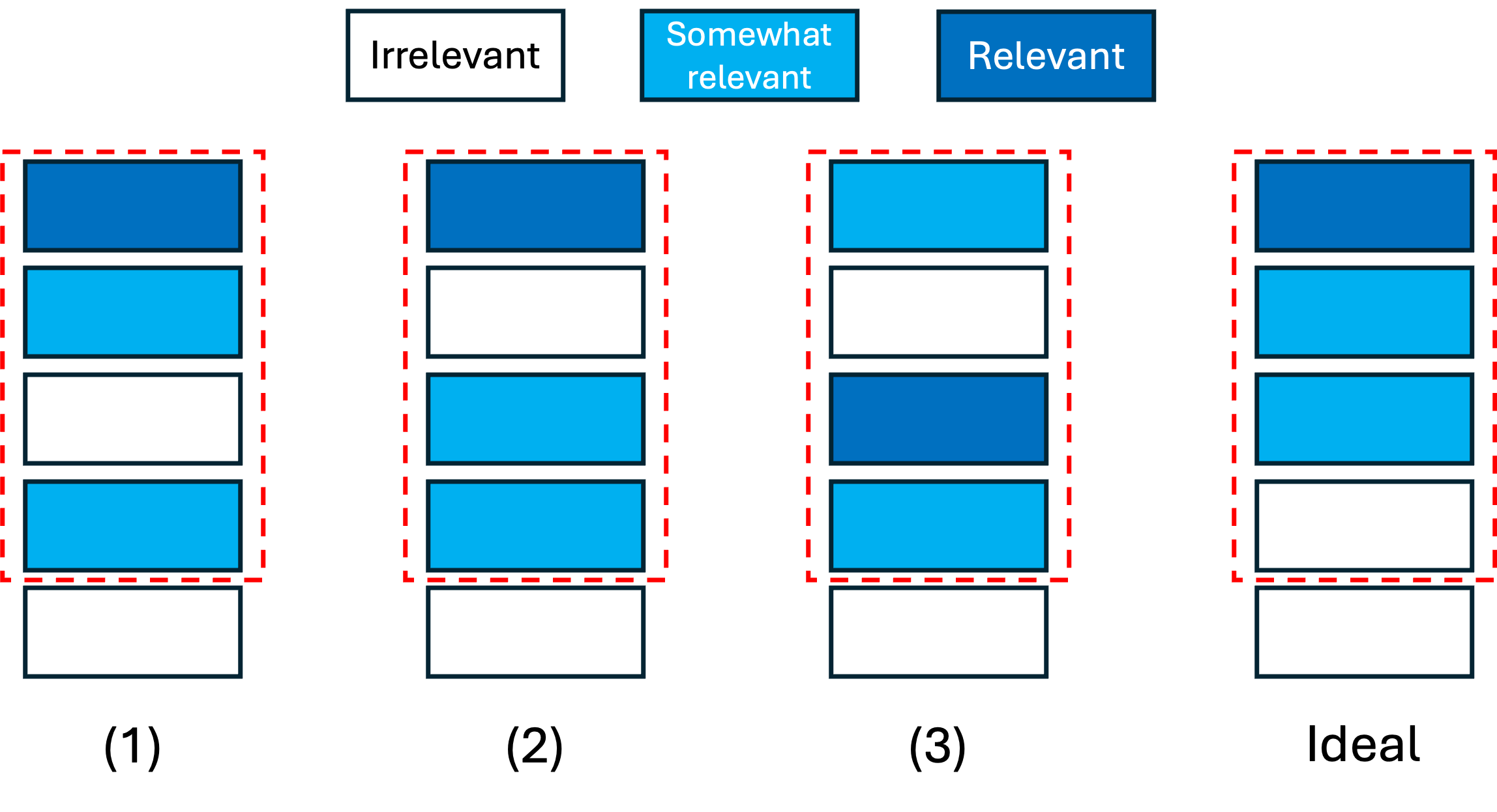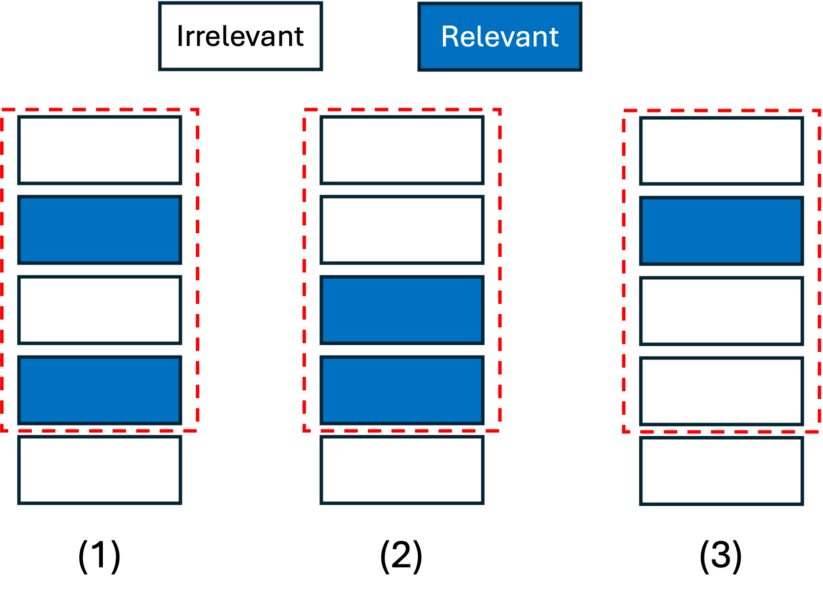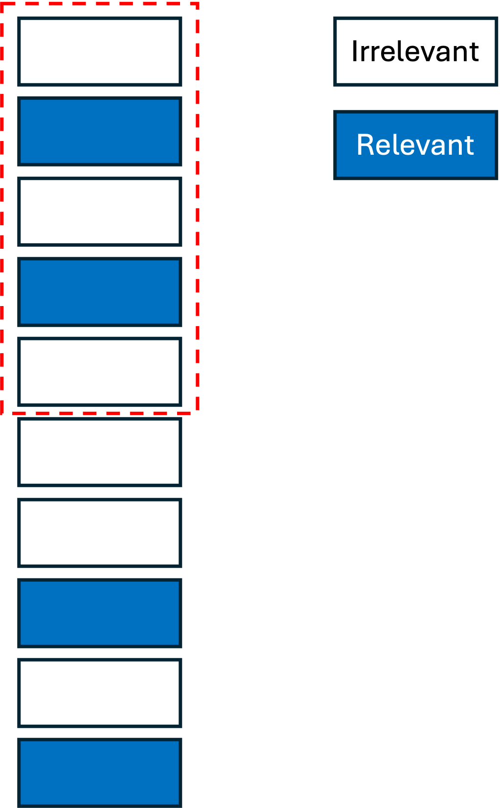 Referring to the example provided in Fig. 4, the Recall@K value is computed as \(2 / 4 = 0.5\). Therefore, Recall@K reduces the sensitivity to K observed in Precision@K. However, although Recall@K is less sensitive to the value of K compared to Precision@K, it is insensitive to the relative ranking of relevant items within the top-K positions. For example, consider a case where only two relevant items exist in the ground-truth data, and both are retrieved within the top-K results but appear at lower ranks (e.g., positions 9 and 10 when K \(= 10\)). In this case, Recall@K equals 1.0, even though the ranking quality is poor.