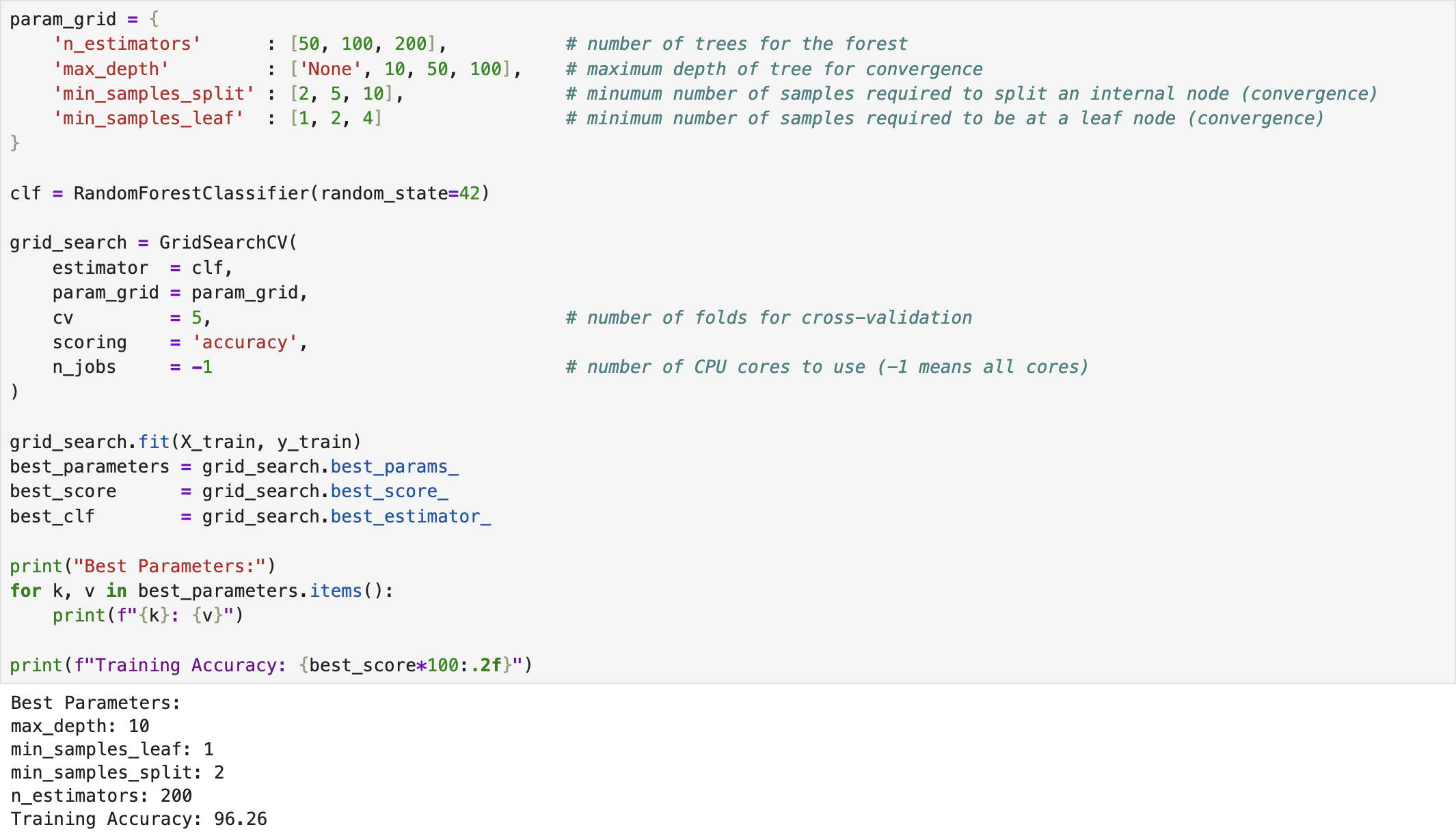 We developed a random forest classifier for the Breast Cancer dataset using the built-in functions provided in scikit-learn [1] in Python. The following screenshot illustrates the training process of the classifier. The model was imported from sklearn.ensemble. Moreover, we applied Grid Search Cross-Validation to identify the optimal hyperparameters of the model. In this process, we defined ranges for various various parameters, such as n_estimators (no. of trees), max_depth, min_samples_split, and min_samples_leaf.