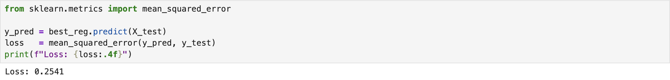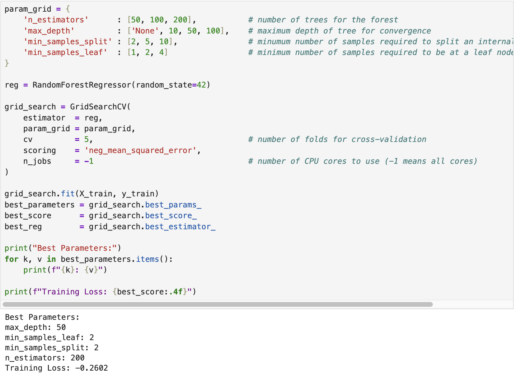 We developed a random forest regressor using the California Housing dataset available in scikit-learn. The following screenshot shows the training (fitting) process of the regressor, where Grid Search Cross-Validation was employed to tune the optimal hyperparameters.