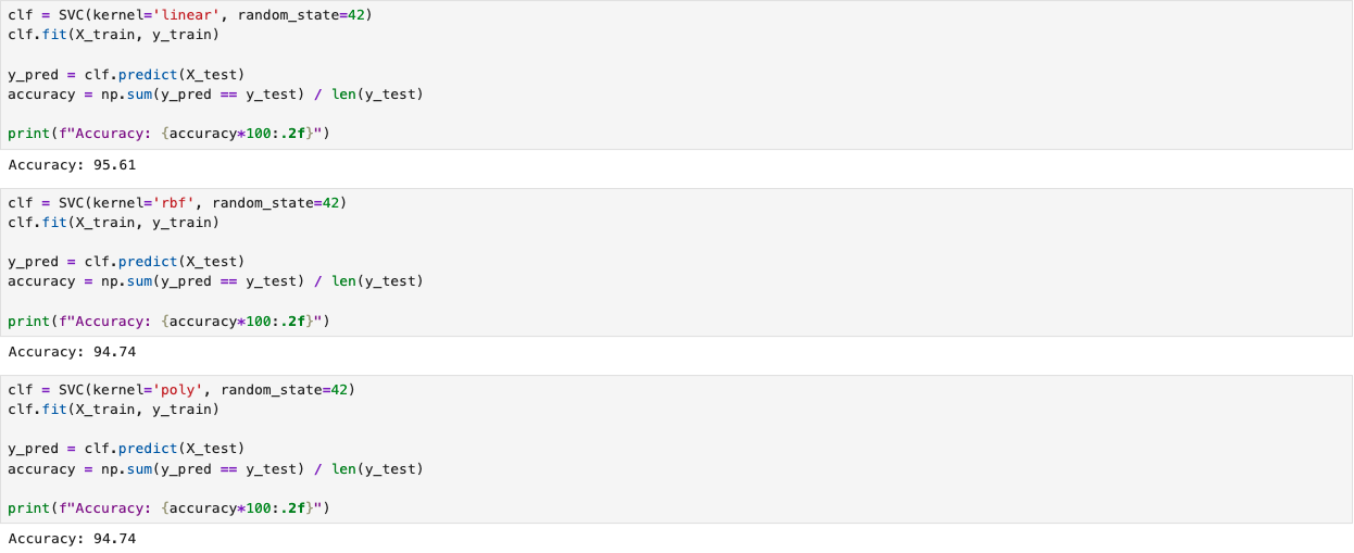 We developed an SVM classifier for the Breast Cancer dataset using the built-in functions provided in scikit-learn [1] in Python. The following screenshot illustrates the training process and the evaluation results of the model. The model was imported from sklearn.svm. The implementation includes all linear, rbf, and polynomial kernels. The complete implementation script is available on the GitHub page SVM Classifier.