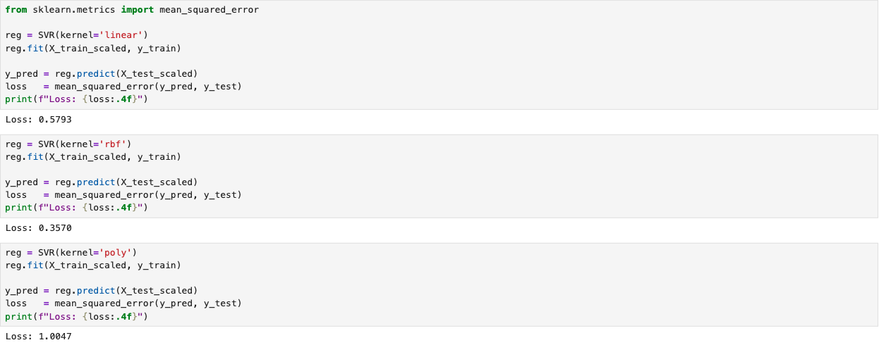 We developed an SVM regressor using the California Housing dataset available in scikit-learn. The following screenshot shows the training (fitting) process the regressor, following by the evaluation results. The implementation includes all linear, rbf, and polynomial kernels. The complete implementation script is available on the GitHub page SVM Regressor.